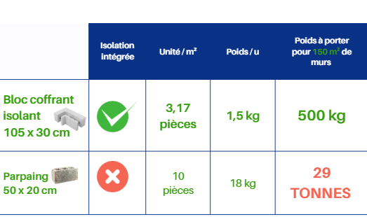 ✅ En résumé : choisir le bloc coffrant isolant, c’est gagner en confort, en rapidité et en performance énergétique, tout en construisant une maison solide et durable.